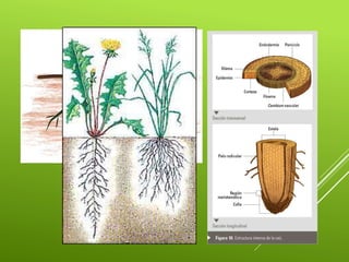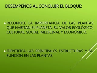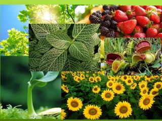 Este documento presenta información sobre las plantas terrestres. Explica que las plantas son organismos complejos que desempeñan un papel importante al proveer oxígeno, alimento y hábitat para otros seres vivos. Detalla las principales estructuras de las plantas como las hojas, tallos y raíces, y sus funciones en la nutrición, transporte y reproducción. Además, destaca la gran importancia biológica, cultural, social y económica de las plantas para los seres humanos y los ecosistemas.