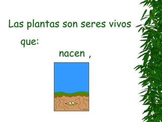 Las plantas son seres vivos que nacen, se alimentan, crecen, se reproducen y mueren. Tienen partes como la raíz, tallo, hojas, flores y frutos, que cumplen funciones importantes como la fotosíntesis, polinización y reproducción. Existen diferentes tipos de plantas como las herbáceas y leñosas, incluyendo árboles y arbustos.