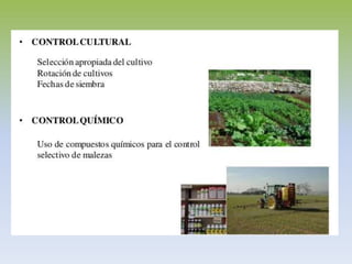 Este documento trata sobre las plantas arvenses. Define las arvenses como plantas que crecen de forma silvestre en campos cultivados. Pueden tener efectos positivos o negativos e interferir con los cultivos ya sea por alelopatía o competencia. De las aproximadamente 250,000 especies de plantas en el mundo, menos de 250 son conocidas por ser competitivas con los cultivos. Las arvenses tienen características como facilidad de dispersión, persistencia, competencia y viabilidad de semillas que las hacen difíciles de manejar en los cultivos.