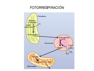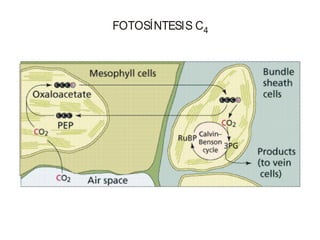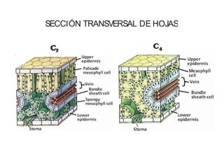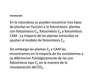 Este documento describe los tres tipos principales de plantas según su fotosíntesis: plantas C3, plantas C4 y plantas CAM. Las plantas C4 pueden absorber CO2 a bajas concentraciones y reducen la pérdida de agua. Las plantas CAM absorben CO2 por la noche y realizan la fotosíntesis durante el día para evitar la evaporación, incluyendo muchas suculentas y cactus. La mayoría de plantas son C3, pero C4 y CAM se encuentran comúnmente en ecosistemas secos donde sus adaptaciones