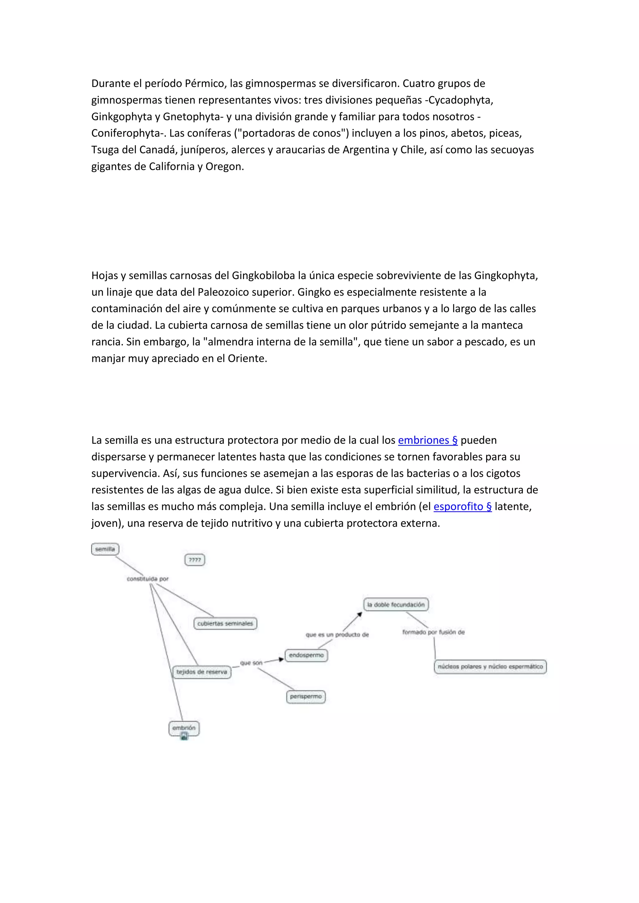 Durante el período Pérmico, las gimnospermas se diversificaron en cuatro grupos, tres de los cuales aún existen: las cícadas, el gingko y las gnetofitas. La división más grande es la de las coníferas, que incluyen pinos, abetos, piceas y otros como secuoyas. El gingko es la única especie sobreviviente de su linaje y es común en parques urbanos a pesar de que sus semillas carnosas huelen mal. Las semillas protegen y dispersan los embriones