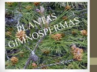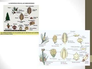 Las gimnospermas son plantas con semillas desnudas que incluyen coníferas como pinos y abetos. Generalmente son leñosas con hojas aciculares o escamosas. Se reproducen mediante flores unisexuales y la polinización produce un óvulo fecundado que se convierte en una semilla. Las coníferas son económicamente importantes por su madera y celulosa.