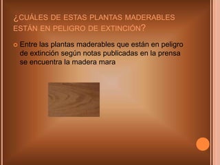 Este documento trata sobre las plantas maderables en Bolivia. Menciona que la madera mara está en peligro de extinción. Explica que Bolivia ha exportado casi 70 especies maderables diferentes a otros países desde 2006, siendo las 9 principales por volumen exportado curupaú, roble, almendrillo, quina quina, cedro, mara, morado, cuchi y tajibo. Además, señala que las exportaciones de productos manufacturados de madera representan el 78% de las exportaciones forestales totales de Bolivia.