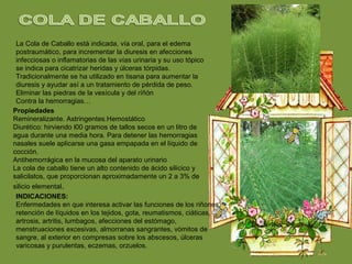 La cola de caballo se indica para el edema postraumático, aumentar la diuresis en infecciones de las vías urinarias, y cicatrizar heridas y úlceras. También se usa tradicionalmente como diurético y para ayudar en la pérdida de peso. Sus propiedades incluyen ser remineralizante, astringente, hemostático y diurético.