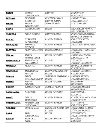 Este documento lista plantas medicinales comúnmente utilizadas en Latinoamérica, sus nombres científicos, las partes de la planta que se utilizan y sus principales propiedades medicinales. Algunas de las plantas mencionadas incluyen manzanilla, boldo, menta, eucalipto, valeriana y zarzaparrilla, las cuales se usan comúnmente para tratar problemas como dolores, inflamación, estrés y desórdenes digestivos.