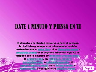 El documento trata sobre la libertad y salud sexual. Define la libertad sexual como el derecho individual sin confundirse con el amor libre o la promiscuidad. Explica que la salud sexual según la OMS es un estado de bienestar físico, emocional y mental relacionado con la sexualidad. Resalta la importancia de cuidar nuestra salud y protegernos usando métodos anticonceptivos para prevenir enfermedades y embarazos no deseados. Concluye que nuestro cuerpo nos pertenece y solo nosotros somos responsables de cuid