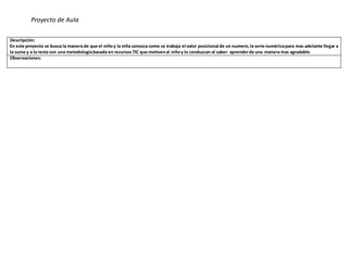 Este proyecto de aula busca enseñar a estudiantes de primer grado conceptos matemáticos como el valor posicional de los números, la serie numérica y las sumas y restas a través de seis sesiones que utilizan recursos TIC como un abaco interactivo, juegos sobre escritura de números y correo. El proyecto evalúa el aprendizaje de los estudiantes y su participación.