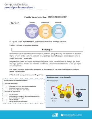 El documento describe las etapas de implementación y evaluación de un proyecto final de diseño. En la etapa de implementación, los estudiantes deben crear un prototipo físico o digital que cumpla con ciertos requisitos, como incluir al menos dos sensores y actuadores programados en Circuit Playground. Luego, en la etapa de evaluación, los estudiantes documentan tres problemas resueltos durante el desarrollo del prototipo y aprendizajes obtenidos.