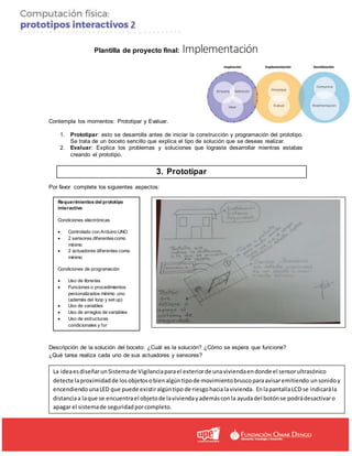 Este documento presenta las etapas finales de implementación y evaluación de un proyecto de prototipo interactivo. La implementación incluye la descripción de la solución propuesta, los requerimientos electrónicos y de programación. La evaluación consiste en probar el prototipo y registrar problemas encontrados y sus soluciones para mejorar versiones futuras.