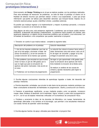 Este documento describe un proyecto final de implementación de un prototipo interactivo con Arduino. Incluye las secciones de prototipar, evaluar y conclusiones. El prototipo consiste en un sistema de seguridad para el portón de una casa controlado con Arduino, sensores y actuadores. Algunos problemas encontrados durante el desarrollo fueron la sensibilidad del sensor de distancia y limitaciones en el giro del servo motor, los cuales fueron resueltos. El proceso permitió desarrollar habilidades en programación y favoreció el aprendizaje.