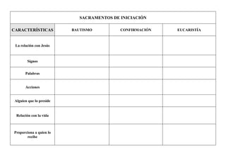 El documento habla sobre los sacramentos de la Iglesia Católica. Explica que los sacramentos se dividen en tres grupos: sacramentos de iniciación (bautismo, confirmación y eucaristía), sacramentos de curación (penitencia y unción de enfermos) y sacramentos de servicio (orden sacerdotal y matrimonio). Describe las características generales de cada sacramento.