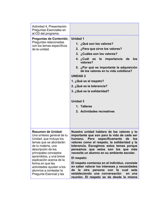 La unidad aborda los valores del respeto, la tolerancia y la solidaridad. Se realizarán actividades lúdicas como juegos y talleres para enseñar a los estudiantes sobre estos valores y su importancia en la vida cotidiana y en la convivencia escolar. El objetivo es que los estudiantes comprendan por qué es necesario conocer y aplicar estos valores en su entorno para tener una mejor interacción con los demás.