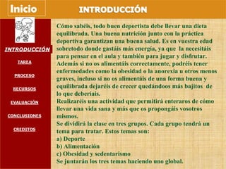 Los alumnos trabajarán en grupos para investigar temas relacionados con una vida sana como la alimentación, el deporte y la obesidad. Cada grupo investigará un tema y juntos crearán un mural visual con la información. El trabajo será evaluado basado en los criterios de la calidad de la información recopilada y presentada en el mural final.