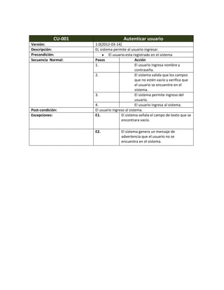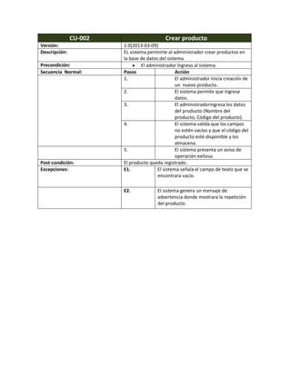 El documento presenta 8 casos de uso para un sistema de inventario. Los casos de uso permiten autenticar usuarios, crear productos, registrar entradas y salidas de productos, consultar productos, modificar productos, desactivar productos y generar reportes. Cada caso de uso describe los pasos, precondiciones, secuencia normal, post-condiciones y excepciones.