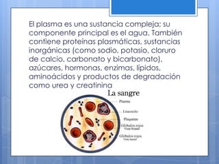 El plasma es un componente sanguíneo líquido que transporta células, proteínas, nutrientes y desechos. Contiene principalmente agua, proteínas, sales inorgánicas, azúcares y otros componentes. El plasma permite que la sangre fluya, suministra proteínas para la coagulación y transporta sustancias como azúcares, sales y hormonas por el cuerpo. Puede donarse mediante plasmaféresis y usarse para tratar enfermedades inmunológicas o trastornos de coagulación.
