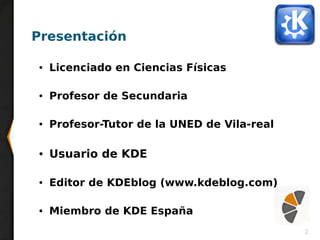 Este documento presenta Plasma Active, un proyecto de KDE para crear una experiencia de usuario basada en software libre para dispositivos táctiles. Actualmente, Plasma Active Three ofrece un espacio de trabajo con actividades y plasmoides para buscar información, jugar juegos, personalizar la pantalla y más. En el futuro, Plasma Active Four mejorará la fluidez, añadirá más aplicaciones y dispositivos compatibles. El documento también muestra una demostración de Plasma Active Three y proporciona recursos adicionales.
