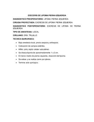 Los documentos describen varios procedimientos quirúrgicos realizados por diferentes cirujanos, incluyendo una plastia inguinal izquierda, una exeresis de lipoma en la pierna izquierda, una desarticulación del cuarto dedo del pie derecho, una resección amplia en la región del puente nasal, una cesárea Kerr, una ligadura de varices esofágicas y una exeresis de tumor en la mama izquierda.