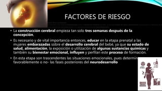 El documento trata sobre la plasticidad cerebral y los factores que influyen en su desarrollo. Explica que el cerebro adulto es muy maleable y se adapta continuamente al entorno. La etapa prenatal y los primeros años de vida son cruciales para el desarrollo cerebral, ya que es influenciado por la salud, alimentación y estado emocional de la madre durante el embarazo. Las exploraciones físicas y neurológicas son importantes para evaluar el neurodesarrollo. El ambiente también juega un papel fundamental, pues los estí