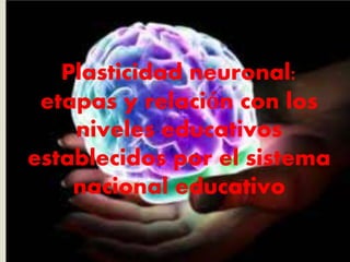 El documento discute la relación entre las etapas de plasticidad neuronal y las etapas educativas establecidas por el sistema educativo nacional. El objetivo es relacionar estas etapas de desarrollo neuronal con las divisiones actuales del sistema educativo. La justificación es que delimitar el paso entre etapas educativas con base en la plasticidad neuronal podría mejorar el desarrollo de habilidades de pensamiento y de las personas. Esto podría implicar ajustes al plan de estudios o planes paralelos de desarrollo durante etapas críticas de plastic