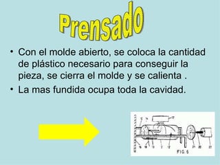 El documento describe diferentes procesos de conformado de plásticos como inyección, extrusión, soplado y laminación por calandrado. La inyección permite fabricar objetos de gran calidad en formas complicadas sin necesidad de operaciones posteriores. La extrusión utiliza una extrusora para colocar plástico fundido en un molde y sellar uno de sus extremos. El soplado es similar a la laminación de metales usando una calandra. La laminación por calandrado se usa principalmente para obtener láminas de PVC.