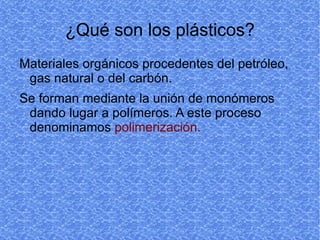 Los plásticos son materiales orgánicos procedentes del petróleo, gas natural o carbón que se forman mediante la unión de monómeros en polímeros a través de un proceso llamado polimerización.