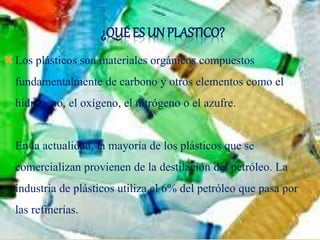 Este documento describe los plásticos, incluyendo su definición como materiales orgánicos derivados principalmente del petróleo, su proceso de fabricación a través de la polimerización de monómeros, y sus principales características como bajo costo, ligereza y maleabilidad. Además, explica las tres categorías de plásticos - termoplásticos, termoestables y elastómeros - según la estructura molecular y capacidad de moldeo.