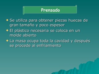 Este documento describe cinco procesos de conformado de plásticos: prensado, extrusión, inyección, soplado y laminado. Explica brevemente cómo funciona cada proceso y menciona que los plásticos tienen ventajas como ser baratos y tener muchos usos pero también inconvenientes como contaminar y deteriorarse con el tiempo.