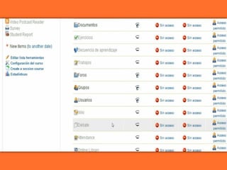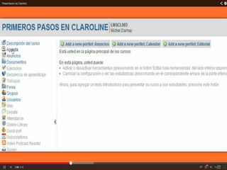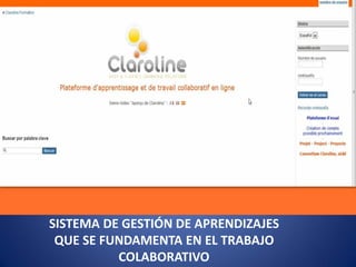Este documento describe las funciones de una plataforma de aprendizaje en línea que permite la creación de cursos, publicación de documentos y ejercicios, discusión en foros, trabajo colaborativo en wikis, y administración de usuarios y grupos. La plataforma también facilita la creación de editoriales y anuncios en la página principal.
