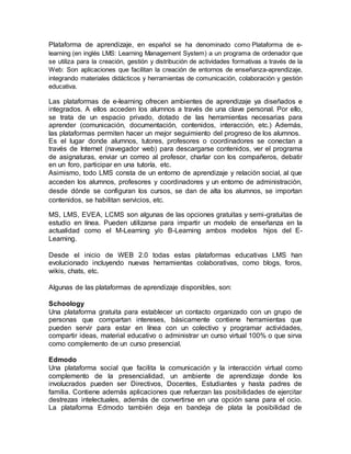 Las plataformas de e-learning, o sistemas de gestión del aprendizaje (LMS), facilitan la creación, gestión y distribución de actividades formativas en línea, proporcionando un entorno privado para estudiantes y educadores. Estas plataformas ofrecen diversas herramientas colaborativas y permiten un seguimiento detallado del progreso de los alumnos. Existen múltiples opciones, tanto gratuitas como de pago, cada una con características específicas para diferentes necesidades educativas.
