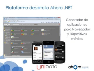 El documento describe una plataforma de desarrollo móvil que permite generar aplicaciones para navegadores y dispositivos móviles. Explica cómo facilitar el acceso de usuarios a aplicaciones existentes y definir nuevas aplicaciones mediante flujos de trabajo y soluciones específicas para diferentes puestos de trabajo. La plataforma ofrece una integración completa de componentes como agendas, gestión documental y otros para mejorar procesos y productividad.