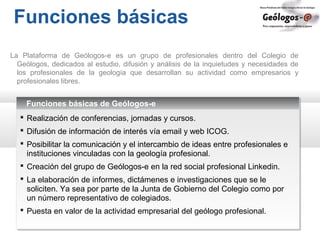 La Plataforma de Geólogos-e es un grupo dentro del Colegio de Geólogos dedicado a estudiar y difundir las necesidades de los geólogos que trabajan de forma independiente. Sus funciones incluyen realizar conferencias y cursos, compartir información, y promover la actividad empresarial de los geólogos. Han creado un grupo en LinkedIn y han realizado varias actividades como una jornada sobre financiación para pymes y un informe sobre la situación de las pequeñas empresas y autónomos geólogos.
