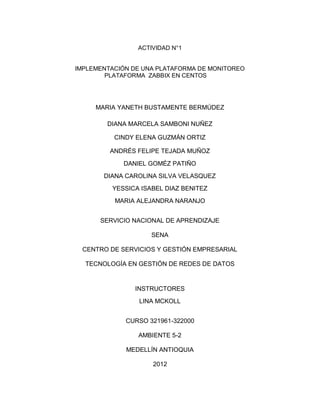 Este documento presenta una introducción a las plataformas de monitoreo Zabbix, Nagios, OpManager, PRTG Network Monitor y Pandora FMS. Explica algunas de sus características clave como el monitoreo de servicios de red, host, recursos de hardware y la generación de alertas. Además, describe funciones comunes como el descubrimiento automático de recursos, monitoreo distribuido, generación de informes y visualización de datos.