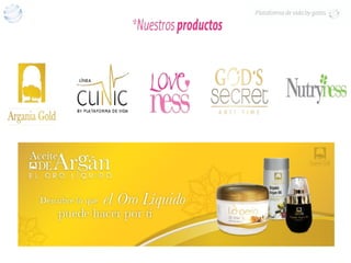 El documento da la bienvenida a los fundadores de la Plataforma de Vida y presenta su misión de crear, crecer y compartir el éxito juntos para transmitir su filosofía de generación en generación. Presenta los productos de aceite de argán y mantequilla de karité de Marruecos, destacando sus beneficios para la belleza y la salud. Finalmente, describe un sistema de mercadeo binario para ganar comisiones por ventas y reclutamiento.