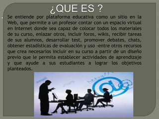 El documento describe las plataformas educativas, que son sitios web que permiten a los profesores crear cursos virtuales con materiales, foros, tareas y evaluaciones. Menciona algunas plataformas populares como Moodle y Claroline, que son de código abierto. También discute los modelos transmisivo y constructivista de enseñanza, señalando que las TIC pueden reforzar o transformar la práctica educativa de acuerdo a cada modelo.