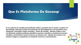 La plataforma Goconqr es un entorno de estudio personalizado que permite a los usuarios crear, compartir y descubrir recursos de aprendizaje como mapas mentales, fichas y apuntes. Está diseñada para fomentar un aprendizaje activo y responsable, tanto para estudiantes como para docentes y empresas, ofreciendo herramientas que facilitan la planificación y monitorización del proceso educativo. Goconqr se adapta a diferentes usuarios y proporciona acceso a una vasta biblioteca de recursos generados por la comunidad.