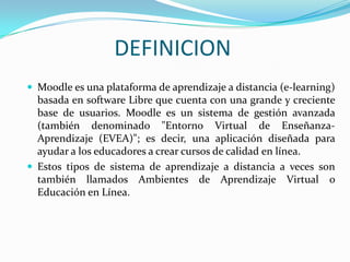 Moodle es una plataforma de aprendizaje abierta que permite a los educadores crear cursos en línea. Se puede instalar en un servidor y ofrece varios módulos como foros, tareas y cuestionarios. Moodle promueve un aprendizaje social y colaborativo a través de estas herramientas. Fue creado para apoyar un enfoque constructivista de la enseñanza y el aprendizaje.