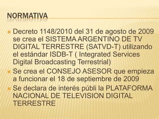 El documento describe el sistema argentino de televisión digital terrestre (SATVD-T), incluyendo la creación del consejo asesor, el desarrollo de la plataforma nacional por parte de AR-SAT, el uso del estándar ISDB-T, la asignación de canales, y el papel de varias universidades e instituciones en el despliegue de la infraestructura.