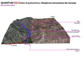 El documento describe tres observatorios astronómicos en Chile: el Observatorio Cerro Mamalluca en Vicuña, el Observatorio Cerro Tololo administrado por universidades estadounidenses y chilenas, y el moderno Observatorio Gemini Sur. También discute conceptos como corredores de observación, eventos astronómicos, y ejemplos históricos de sitios con importancia astronómica como Stonehenge, Machu Picchu y las líneas de Nazca.