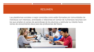 El documento habla sobre las plataformas sociales y su importancia en el ámbito educativo. Explica que las plataformas sociales son comunidades formadas por personas con intereses en común y que pueden usar diversos recursos para ampliar el aprendizaje de los estudiantes. También menciona que las redes sociales son una gran herramienta educativa que permite el aprendizaje colaborativo.