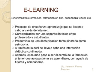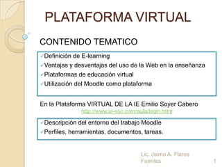 Este documento presenta información sobre el e-learning y las plataformas virtuales de educación. Define el e-learning, discute sus ventajas y desventajas, y describe siete plataformas virtuales populares como Moodle, Dokeos y Sakai. También incluye instrucciones para acceder a la plataforma virtual de la institución y completar una tarea de evaluación explorando las características de Moodle.