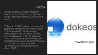 Dokeos es una plataforma de aprendizaje virtual de código abierto desarrollada en PHP y MySQL. Permite crear cursos online con funciones como publicación de contenidos, foros, grupos de estudiantes, calendarios y seguimiento del progreso de los alumnos. Se puede instalar en un servidor o usar el alojamiento gratuito en la página web de Dokeos.