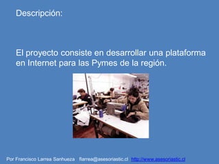 El documento describe un proyecto para desarrollar una plataforma web que brindará asistencia técnica y permitirá a las pequeñas y medianas empresas promocionar y vender sus productos y servicios. La plataforma proporcionará información sobre temas legales, financieros y de marketing, además de permitir que las empresas creen portales y participen en redes sociales y ferias virtuales. El proyecto está actualmente en la etapa de planificación y se espera que aumente significativamente las ventas de las pequeñas empresas al expon