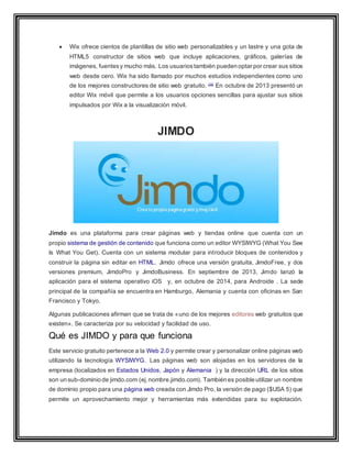 Wix es una plataforma basada en la nube que permite a los usuarios crear sitios web y aplicaciones a través de herramientas de arrastrar y soltar. Los usuarios pueden agregar funciones como comercio electrónico y formularios a sus sitios usando aplicaciones de Wix o de terceros. Wix genera ingresos a través de suscripciones premium que permiten conectar dominios personalizados y eliminar anuncios. Jimdo también permite crear sitios web y tiendas online de forma gratuita o paga a través de un editor WY