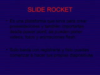 Este documento presenta resúmenes de cuatro plataformas informáticas: Slide Rocket, una plataforma para crear y compartir presentaciones; Zoho, una suite de aplicaciones web para gestión empresarial incluyendo correo y almacenamiento en la nube; PreZentit, una herramienta en línea para crear y mostrar presentaciones; y Google Docs, un editor de documentos en la nube que incluye procesador de texto y hoja de cálculo.