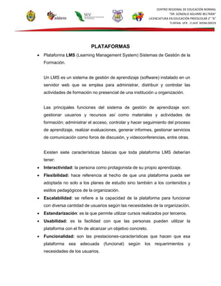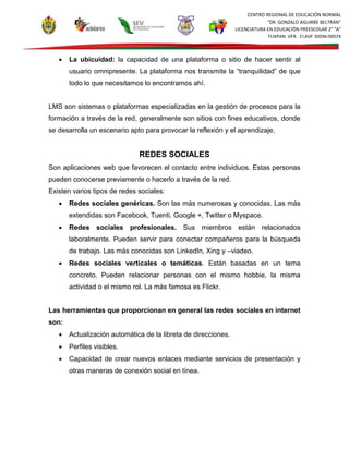 El documento describe las características principales de las plataformas de gestión del aprendizaje (LMS) y las redes sociales, así como sus usos potenciales y riesgos en educación. Un LMS es un sistema web que administra actividades de formación no presencial al gestionar usuarios, materiales, evaluaciones e informes. Las redes sociales permiten la interacción entre personas y pueden clasificarse en genéricas, profesionales o temáticas. Si bien pueden usarse para actualizar conocimientos, también plantean riesgos como la p