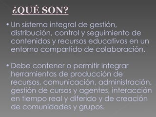 El documento habla sobre diferentes plataformas de aprendizaje virtual como Moodle. Moodle es un sistema de gestión de aprendizaje de código abierto que permite a profesores crear cursos en línea con diferentes herramientas. Otras plataformas mencionadas incluyen Caroline, que es fácil de usar e instalar y permite diferentes roles de usuario, y Merlín, que usa inteligencia artificial para monitorear el progreso de los estudiantes.