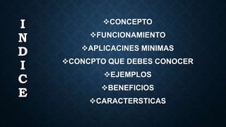 Este documento describe las plataformas virtuales, que son programas informáticos orientados a Internet para el diseño y desarrollo de cursos o módulos didácticos en línea. Explica cómo funcionan plataformas como Moodle y Claroline, sus aplicaciones mínimas, conceptos clave como e-learning y b-learning, ejemplos de plataformas como Coursera y Tutellus, los beneficios que ofrecen como la comunicación profesor-alumno y el acceso a la información, y sus características como la flexibilidad y