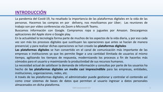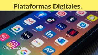El documento analiza la importancia y características de las plataformas digitales, destacando su rol en la vida diaria y empresarial desde la pandemia de COVID-19. Se describen las diferentes funciones y tipos de plataformas, así como su evolución histórica y los efectos de red que potencian su valor. Además, se abordan las ventajas y desventajas de estas herramientas, enfatizando su impacto en la eficiencia y conectividad en diversos contextos laborales y personales.