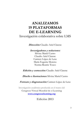 El documento analiza 19 plataformas de e-learning (LMS) categorizadas como software libre, comerciales y en la nube. Primero revisa conceptos clave sobre LMS y sus características más importantes. Luego compara cada plataforma, describiendo sus funciones, ventajas y desventajas. El objetivo es proveer información para la selección e implementación de un LMS según las necesidades de cada institución educativa.
