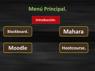 Este documento describe varias plataformas educativas digitales, incluyendo Blackboard, Moodle, Mahara y Hootcourse. Blackboard es una plataforma utilizada a nivel mundial por instituciones educativas para administrar el aprendizaje en línea. Moodle es un sistema de gestión de cursos de código abierto que ayuda a los educadores a crear comunidades de aprendizaje en línea. Mahara es una aplicación para crear y mantener portafolios digitales y redes sociales. Finalmente, Hootcourse permite crear clases virtuales us
